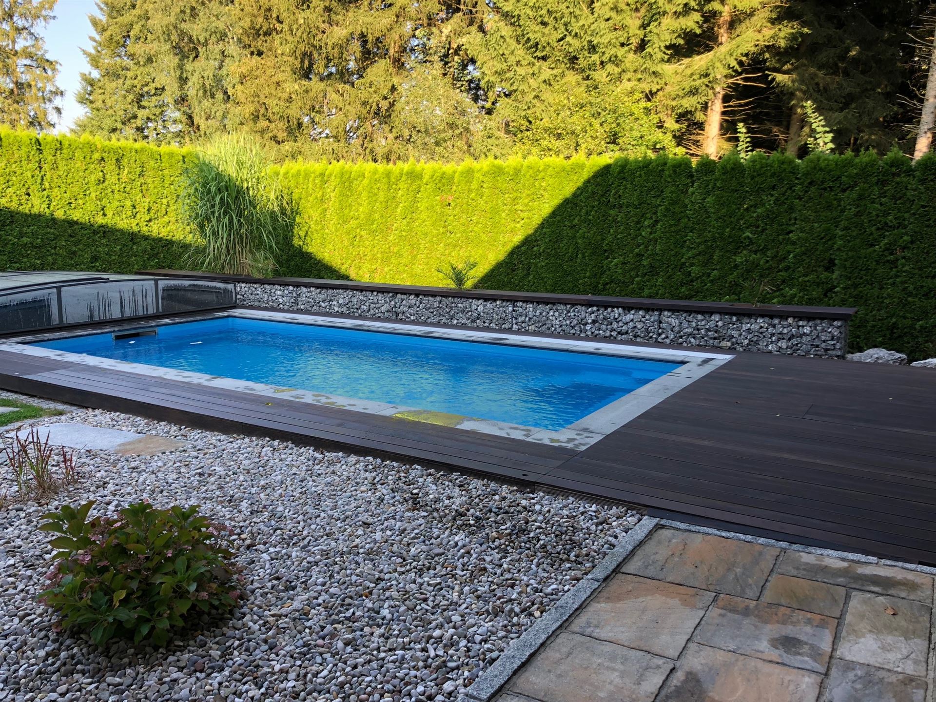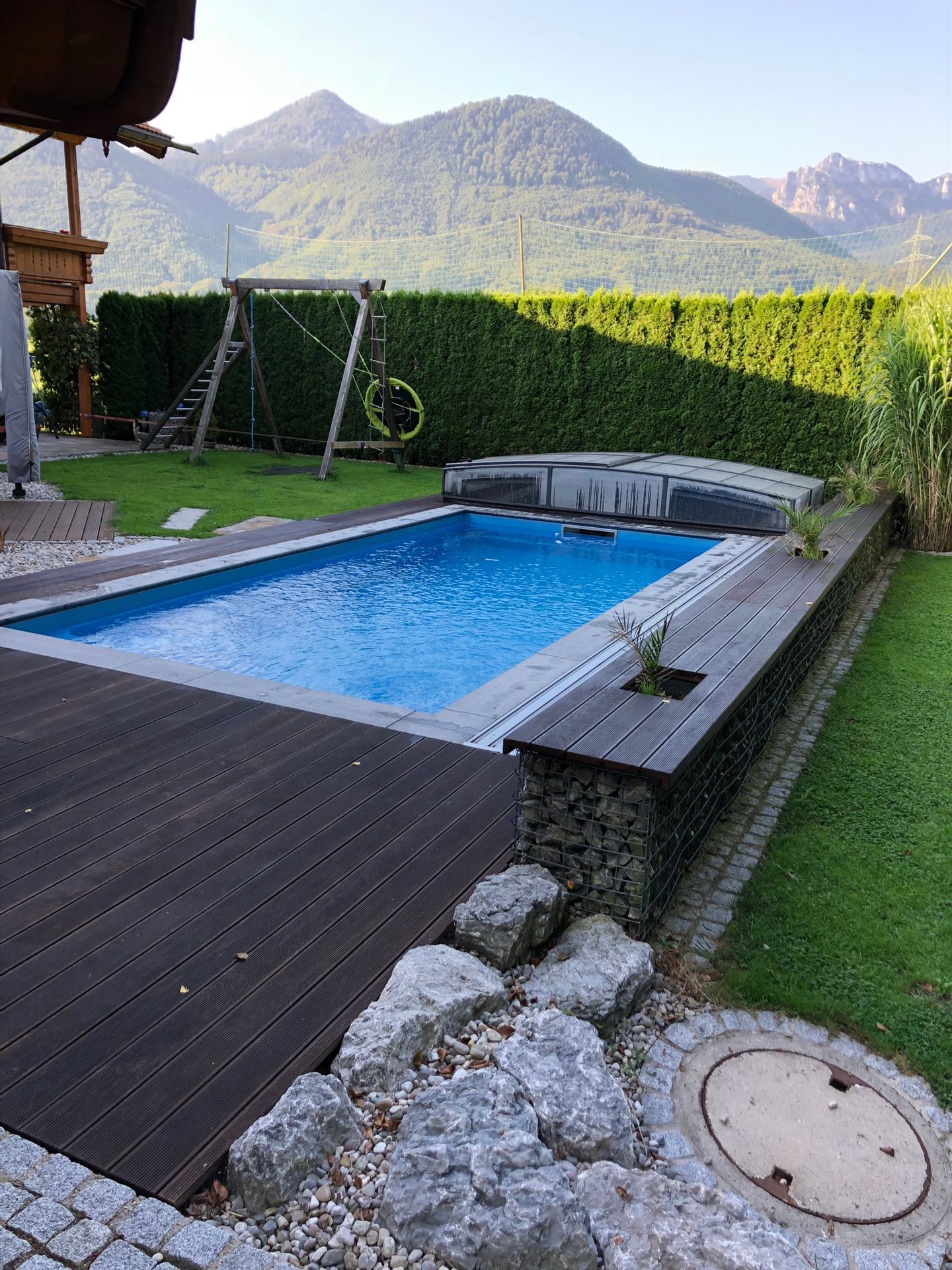 Eine Holzterrasse lädt zum Feiern, Spielen oder einfach nur Relaxen ein.