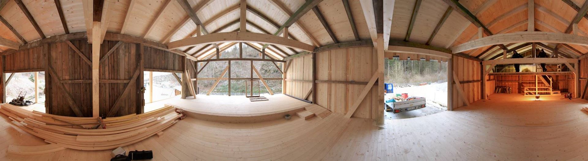 Leicht und hell wirkende Bauten durch freitragende Leimbinder-Konstruktion mit dünnen Zugstangen machen Ihre Bauten zu einem Erlebnis.